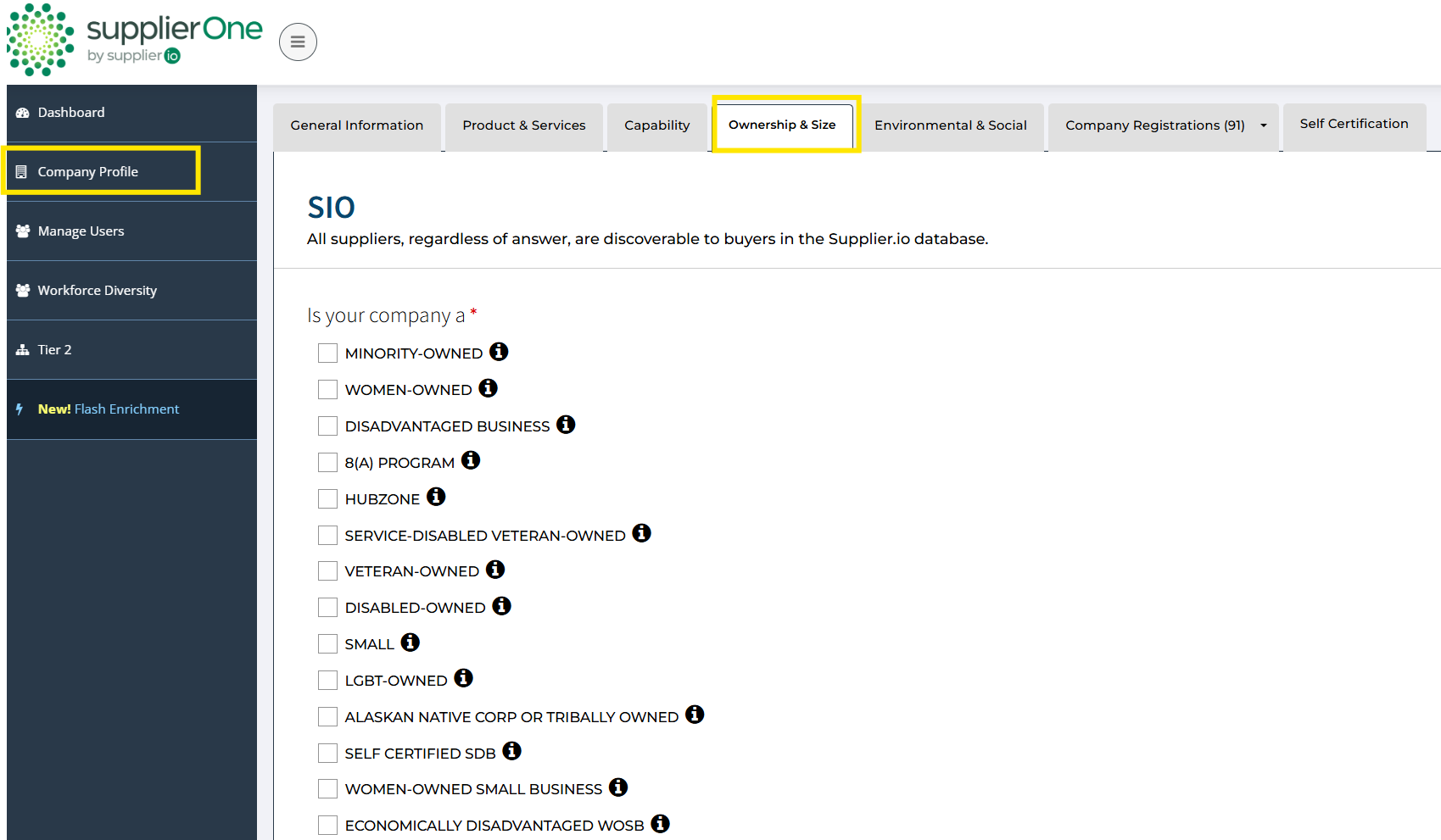 - Select the 'Ownership & Size' tab, which displays the list of certifications in your profile.